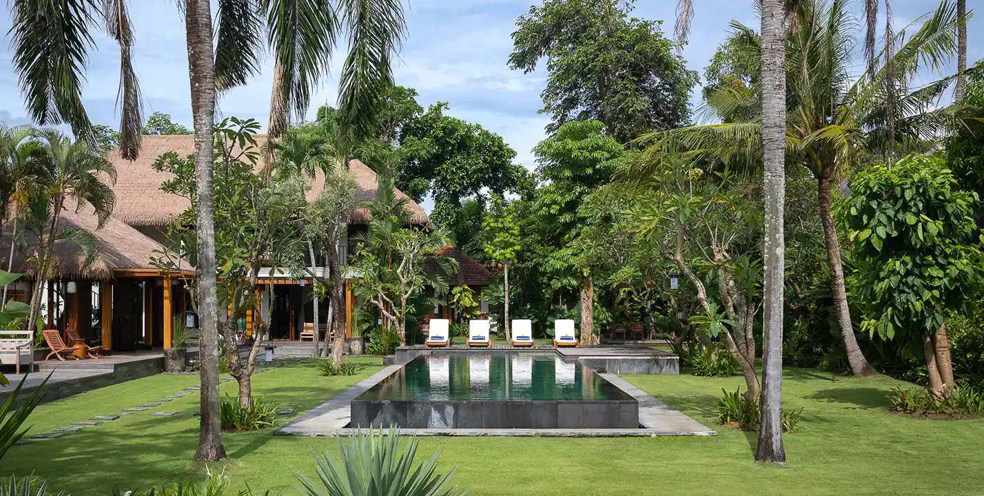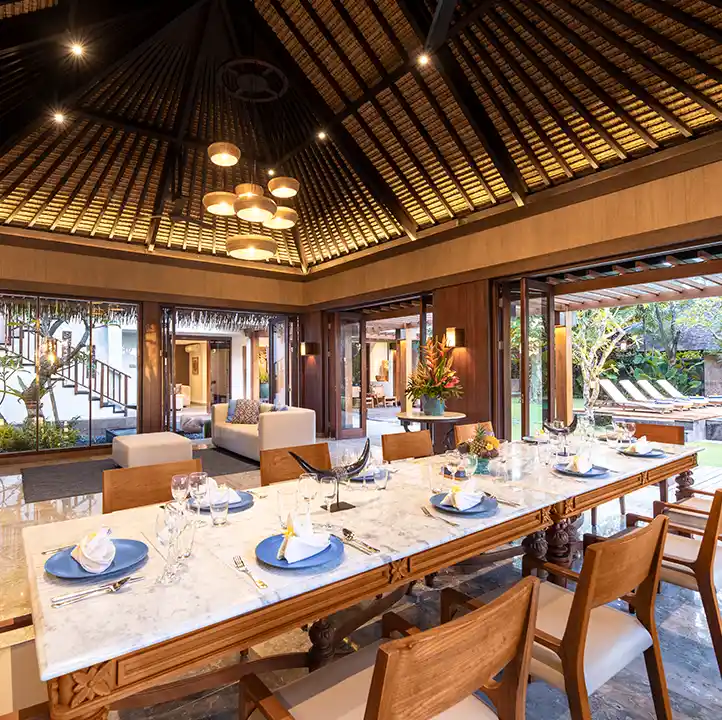 The design is a skilful blend of traditional Balinese architecture and 21st Century luxury, with a layout that is perfectly crafted for multiple, or multi-generational, families. Within the handsome interiors, acres of marble or tropical timber floors dotted with beautifully curated modern and heritage furniture sweep under soaring vaulted ceilings.